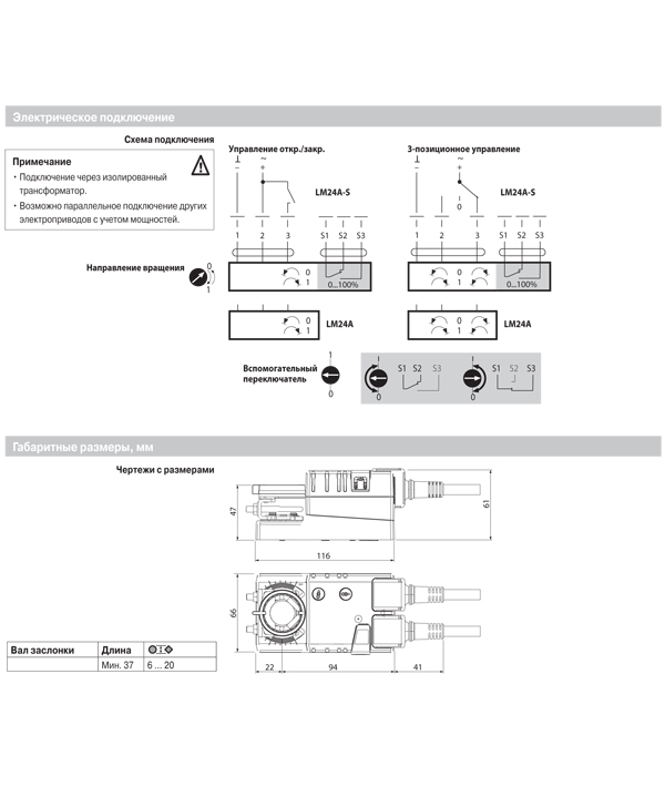 Электропривод работает от сети 24 В.