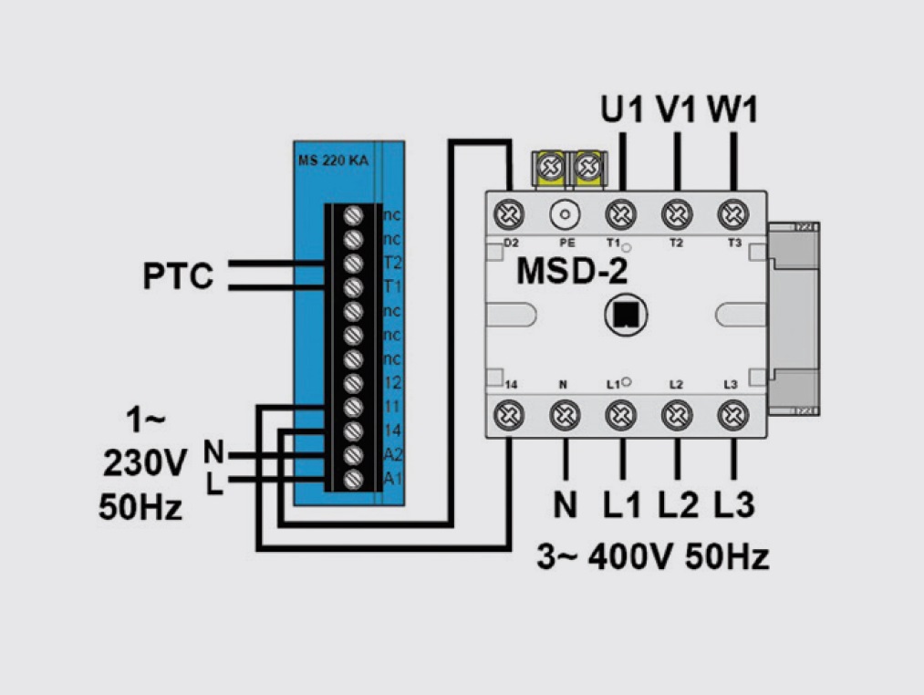 Устройство защиты трехфазных электродвигателей, оборудованных терморезисторами (PTC). MSK ЕХ состоит из автоматического выключателя и защитного реле.