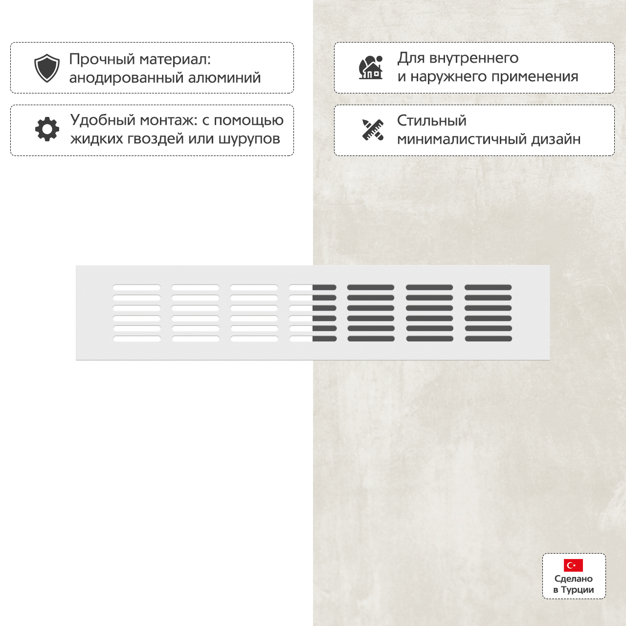Прямоугольная вентиляционная решетка изготовлена из анодированного алюминия.