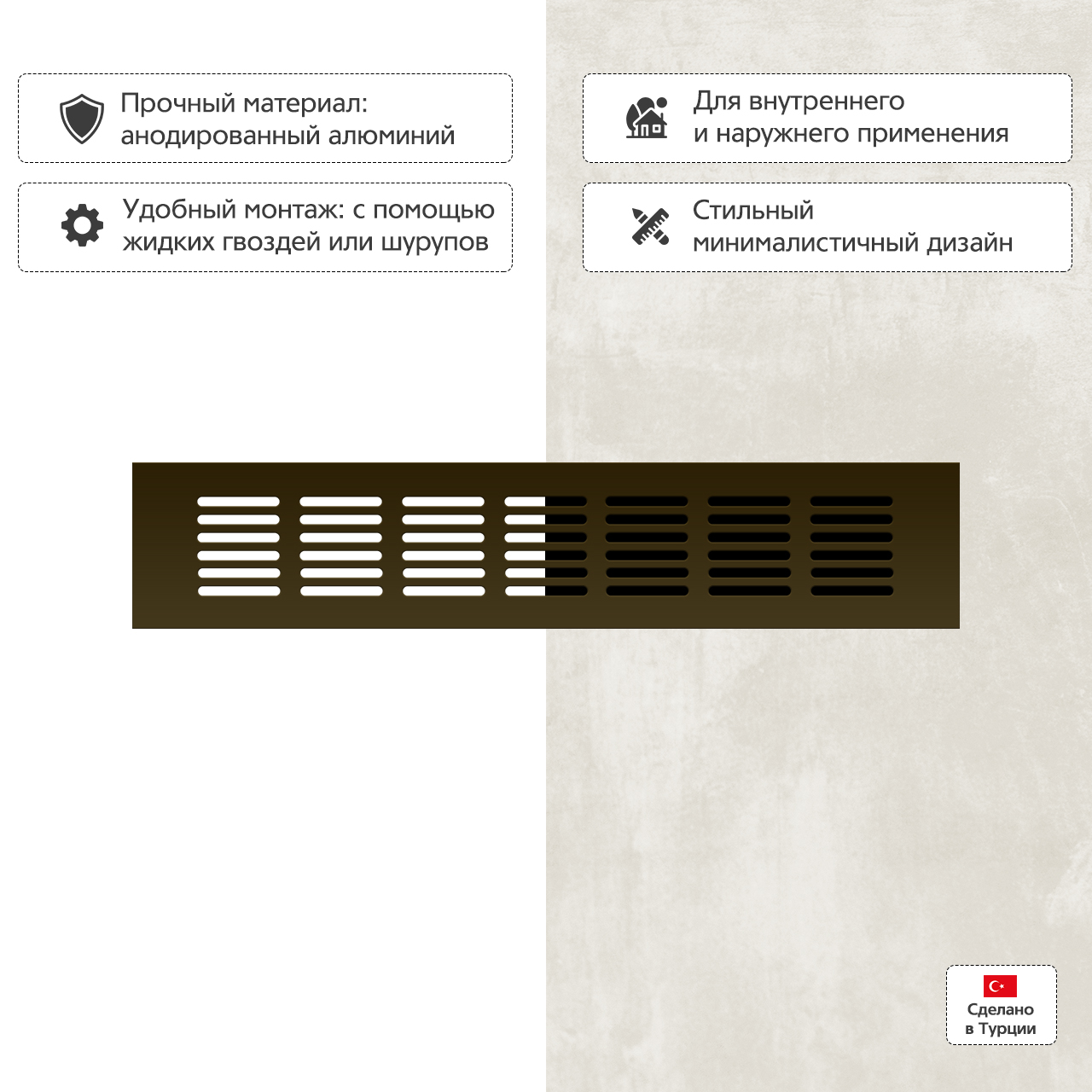 Прямоугольная вентиляционная решетка изготовлена из анодированного алюминия.