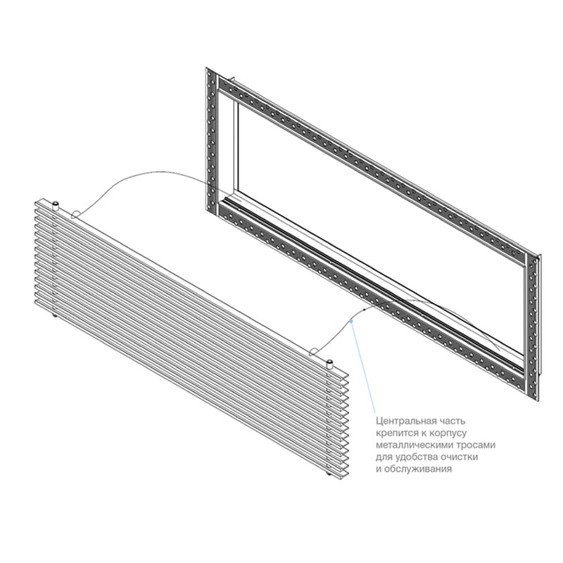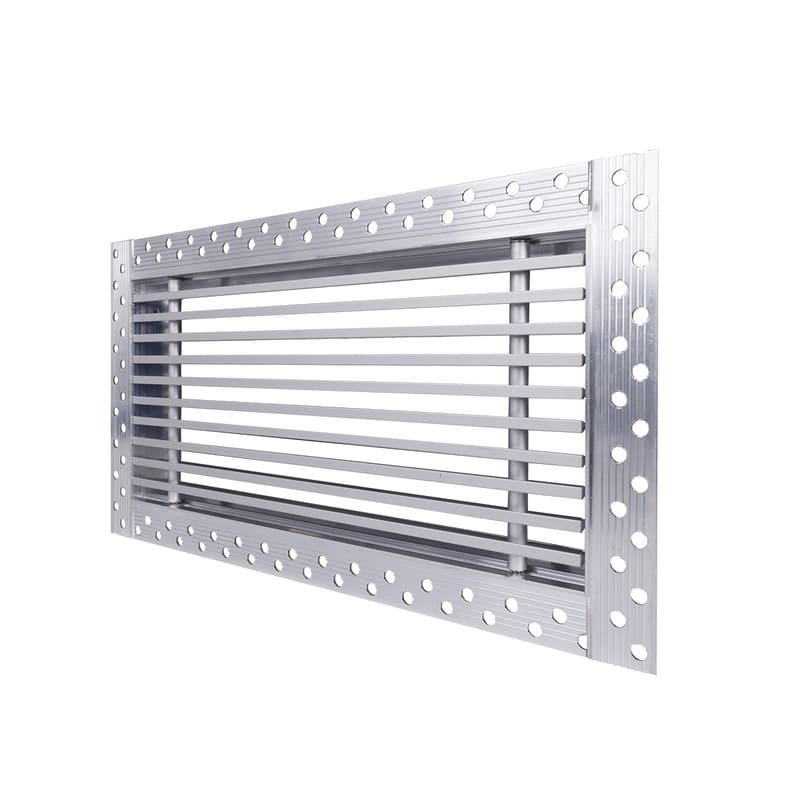 Данная решетка подходит для монтажа на любую поверхность под финишную отделку. Рамка и экран изготовлены из алюминия, опора экрана - из оцинкованной стали. Рама оснащена «полкой» 1,9 мм и рифлеными краями для большей адгезии финишного материала – шпатлевки, цемента. Решетка имеет съемную центральную часть с фиксированным углом наклона ламелей 0°. Она крепится к корпусу прочными металлическими тросиками, легко снимается для очистки и удобного обслуживания.