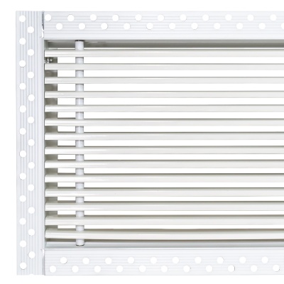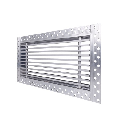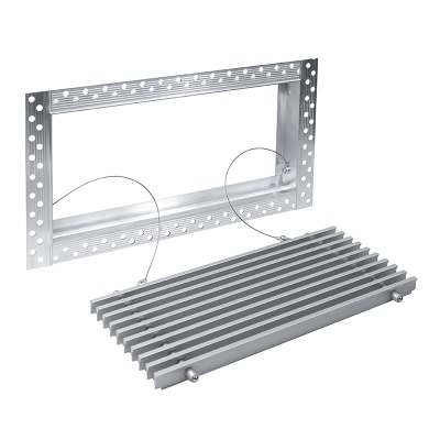 Данная решетка подходит для монтажа на любую поверхность под финишную отделку. Рамка и экран изготовлены из алюминия, опора экрана - из оцинкованной стали. Рама оснащена «полкой» 1,9 мм и рифлеными краями для большей адгезии финишного материала – шпатлевки, цемента. Решетка имеет съемную центральную часть с фиксированным углом наклона ламелей 15°. Она крепится к корпусу прочными металлическими тросиками, легко снимается для очистки и удобного обслуживания.
